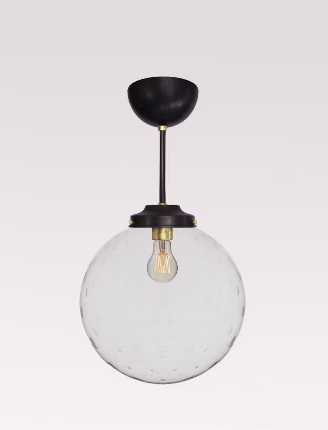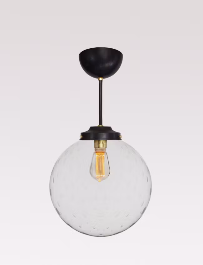 Our beautiful turn of 20th-century model pendants are bespoke built to order and hand assembled using new components  which are still pressed in the same design forms for over 100 years. They are oxidized by hand using a cold oxidizing method and then oil rubbed to cure the finish. The armature looks black but on close inspection can shift slightly in nuances, which only adds and enhances the look of the era. These pendants are made to order in-house here at 2 Little Spoons in Sweden and are available with various glass and drop sizes. The globes are mouth-blown and the hole opening will allow for a standard 6 cm or the slightly larger 8 cm Edison screw light-bulb/lamp. We only use the best quality materials and all lamps are assembled and checked by an electrician.