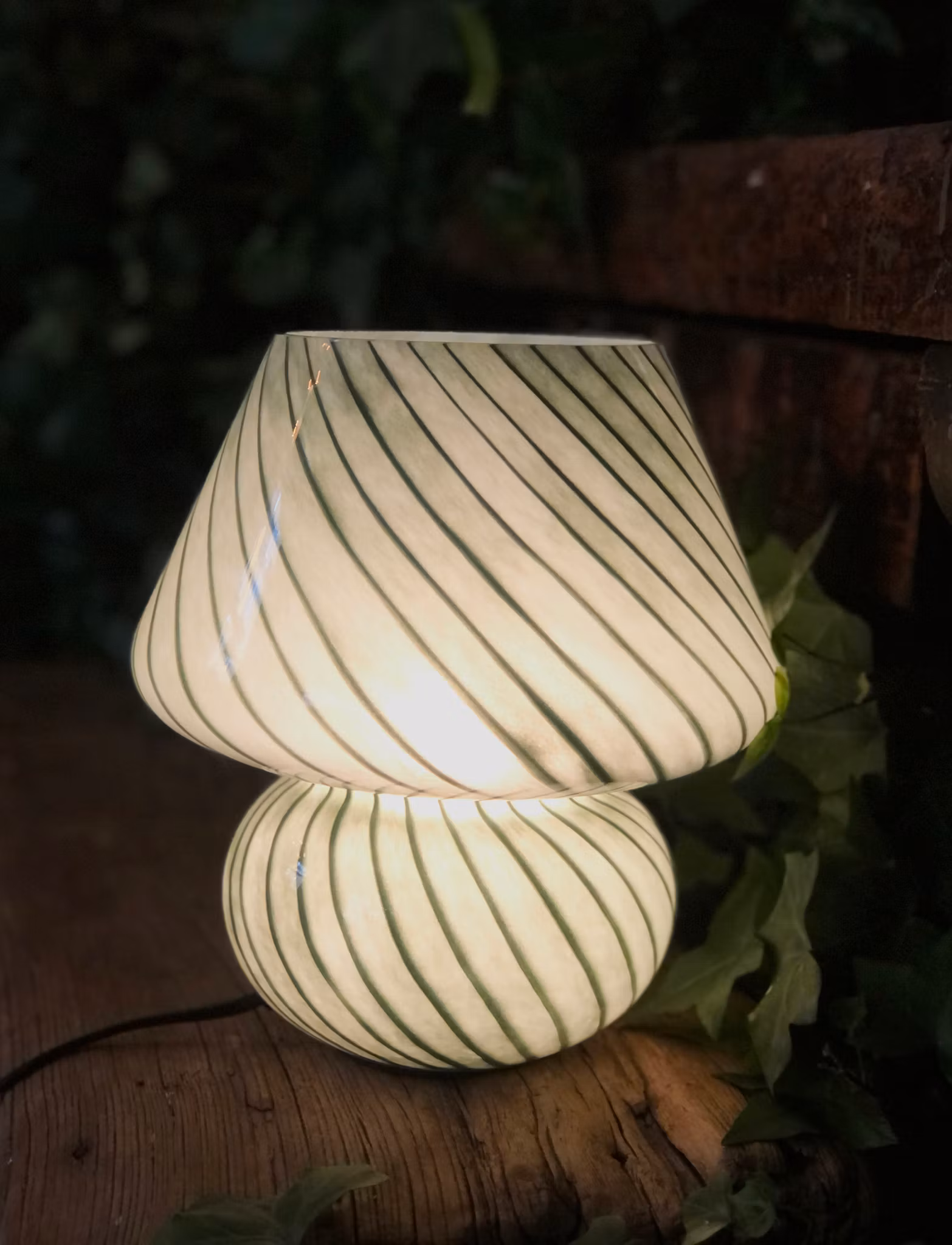A beautiful glass table lamp, where each lamp has a unique pattern. The mushroom shape takes us back to the 70s. Both playful and decorative. The mushroom lamp provides a pleasant light and it fits perfectly on the shelf, in the window or on the table. A mood enhancer wherever you place it.