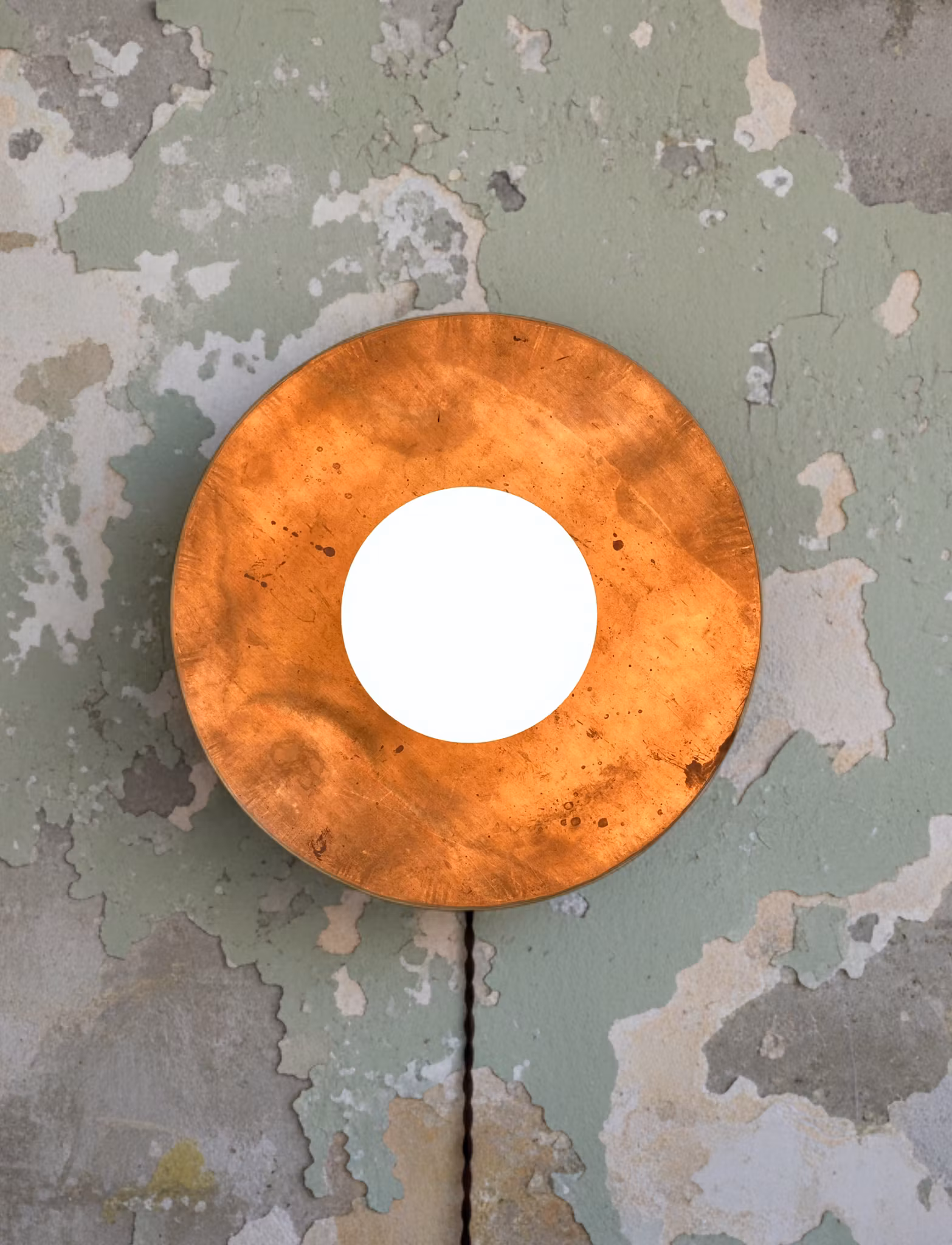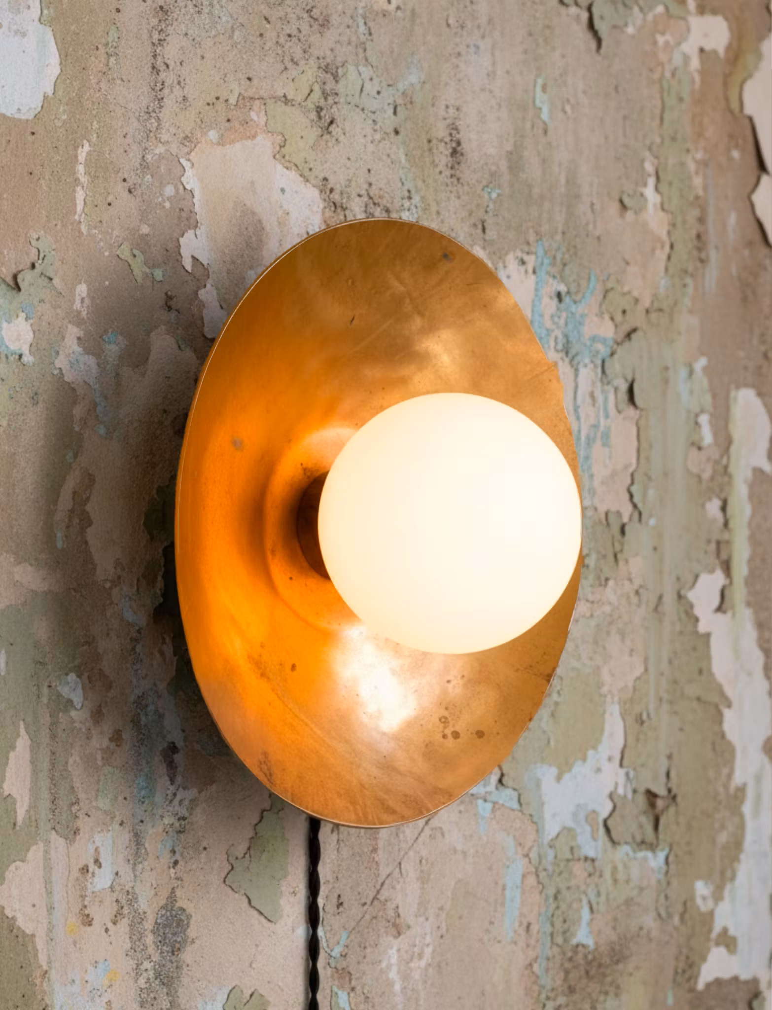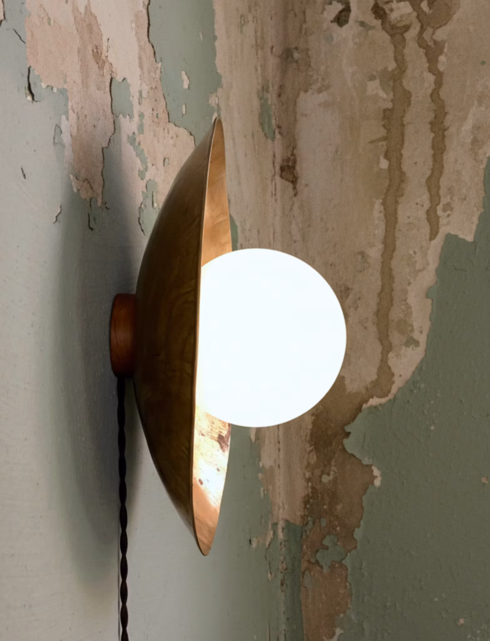 Dessa unika och vackert enkla vägglampor är handgjorda på beställning här i Stockholm, bestående av rå mässing och opalglas med teakrot detaljer. Lamporna är anslutna med tvinnad textilkabel, försedda med en ny in-line dubbelpolig strömbrytare och väggkontakt. Lamporna är även utrustade med en 120 mm opal glob och levereras med 3-stegs minnesdimbar opal lampa. Lampan uppfyller alla CE-föreskrifter och har monterats av en elektriker. Varje lampa är unik då den är gjord av naturmaterial och kan skilja sig något från den på bilden.